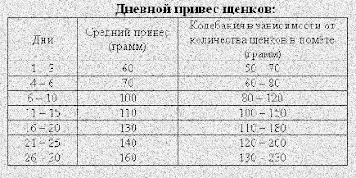 Приведу таблицу примерного веса щенков служебных пород по дням в течение первого месяца жизни: